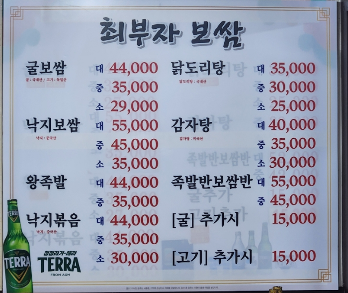 - 낙지보쌈 소/중/대 : 35,000 / 45,000 / 55,000원